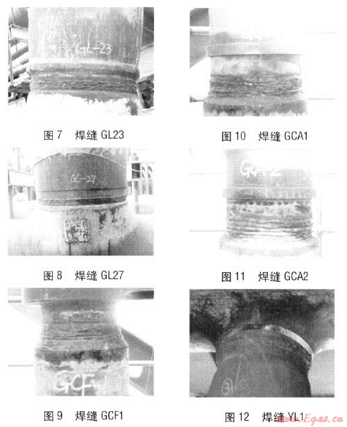 該鍋爐的設(shè)計(jì)結(jié)構(gòu)存在以下特點(diǎn):部分母材管件為三通式,連接方式為焊接連接,焊縫靠近三通管件的根部,且兩焊接件之間因壁厚不同,在焊縫附近形成不同程度的凸臺(tái)。我們篩選出12道典型的焊縫,焊接管道相關(guān)參數(shù)見表1,焊縫外觀見圖1~12.其中焊縫GL1的凸臺(tái)較小。由于凸臺(tái)與焊縫距離較近,導(dǎo)致無損探傷(射線、超聲波探傷)不能正常進(jìn)行。對(duì)于在安裝現(xiàn)場(chǎng)發(fā)現(xiàn)的問題,由于新建電廠鍋爐多,設(shè)備外形較大、生產(chǎn)期長,鍋爐制造單位往往難以在限定的期限內(nèi)對(duì)設(shè)備進(jìn)行設(shè)計(jì)修改和現(xiàn)場(chǎng)改造。