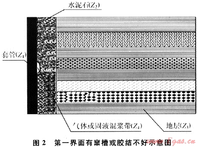 由于Z1>Z2>Z4,因此σ-σ1<0而β-β1>0,即第一界面膠結(jié)好時,反射能量比膠結(jié)不好時的反射能量要小,透射能量比膠結(jié)不好時的透射能量要大。換言之,膠結(jié)好時,能量大部分進(jìn)入水泥環(huán),較少折回到聲波接收器。套管外壁與水泥膠結(jié)越好,聲波能量從套管越過界面向水泥傳遞時,套管波能量越?。环粗坠苤械穆暡芰烤驮酱?;若沒有水泥,套管中的聲波能量就可達(dá)到最大值。在膠結(jié)完好的井段,呈現(xiàn)聲波幅值很低的平滑曲線,膠結(jié)較差的井段會出現(xiàn)較大的異常。聲波幅度測井(CBL)測量的是沿套管傳播的滑行波的首波幅度值(其與能量成正比)。套管波首波幅度的大小取決于套管與水泥環(huán)之間有無第三介質(zhì)及第三介質(zhì)的聲阻抗大小。