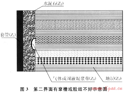 如圖3所示,當(dāng)?shù)诙缑婺z結(jié)質(zhì)量較差時,與前面對第一界面膠結(jié)不好的分析類似,水泥環(huán)與地層之間存在第三介質(zhì),第三介質(zhì)一般反映為氣體、液體或固液混漿。
