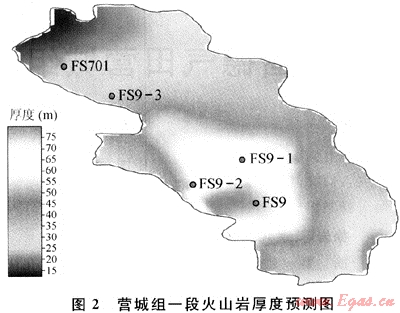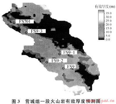 3) 屬性模型。研究區(qū)屬性建模采用測(cè)井曲線生成法,利用井筒巖石密度曲線數(shù)據(jù)建立密度模型[4]。由于火山巖與圍巖的區(qū)分十分復(fù)雜,單一屬性不能很好描述儲(chǔ)層分布[5],所以采用巖石密度和伽馬曲線這兩種對(duì)火山巖儲(chǔ)層較敏感參數(shù)進(jìn)行建模,所以本區(qū)建立了密度和伽馬模型,并根據(jù)有效厚度劃分標(biāo)準(zhǔn),預(yù)測(cè)了營(yíng)城組一段有效厚度分布。本次建模過(guò)程中將密度曲線粗化后,進(jìn)行變差函數(shù)分析,正確的變異函數(shù)估計(jì)要求對(duì)采樣方式、均值變化或樣品承載大小以及變異函數(shù)對(duì)方位變化的敏感性作出全面的評(píng)價(jià)。然后用密度反演體作為協(xié)變量,進(jìn)行10次隨機(jī)實(shí)現(xiàn)[6~7]。圖2為通過(guò)昌德氣田的密度屬性模型得出的營(yíng)一段儲(chǔ)層厚度預(yù)測(cè)圖,F(xiàn)S9區(qū)塊發(fā)育一個(gè)經(jīng)過(guò)FS701、FS9-1、FS9井的北西向火山巖條帶。