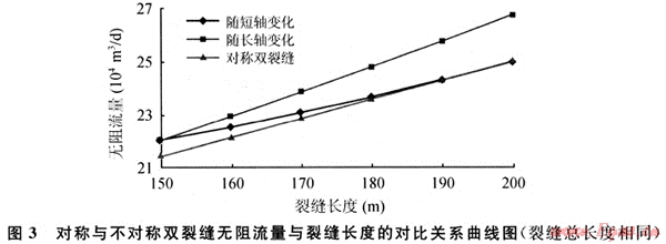 根據(jù)不對稱裂縫產(chǎn)能模型,分別計算了壓裂不對稱單裂縫與雙裂縫氣井的產(chǎn)能,從圖3可以看出,隨著裂縫長度的增加,裂縫控制的泄氣面積不斷增大,壓裂不對稱單裂縫與雙裂縫氣井的產(chǎn)能均不斷增加,但是隨長軸變化下的無阻流量增加的幅度要大一些。