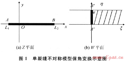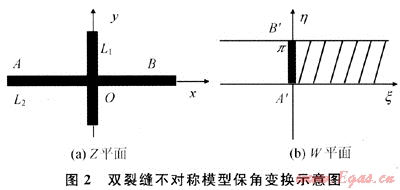 如圖1所示,采用保角變換函數(shù)將Z平面上建立的x-y不對稱裂縫坐標(biāo)系轉(zhuǎn)化為W平面車ε-η坐標(biāo)系,可用于描述儲層不對稱裂縫的流動形態(tài)對壓裂后產(chǎn)能的貢獻。