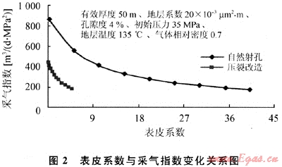 從模擬看(圖2),壓裂井表皮系數(shù)在0.3時,采氣指數(shù)與零表皮對比下降幅度在10%左右,由于壓裂井表皮系數(shù)普遍較低,因此表皮系數(shù)對壓裂井產(chǎn)能影響較小。射孔完井的井表皮系數(shù)一般較高,因此表皮系數(shù)對產(chǎn)能的影響較大,如果表皮系數(shù)達到20,則采氣指數(shù)與表皮系數(shù)為0時的對比下降幅度達到68%。有些射孔完井的井在試采中產(chǎn)量與壓力保持穩(wěn)定,關(guān)井后壓力恢復程度高,恢復速度快,但采氣指數(shù)并不高,與表皮系數(shù)的影響有很大關(guān)系。