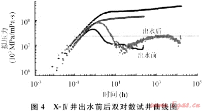 從前后兩次壓力恢復試井解釋看,氣層出水后大大降低了氣相的有效滲透率,產(chǎn)水后的氣相滲透率只有產(chǎn)水前的1/4左右(圖4)。