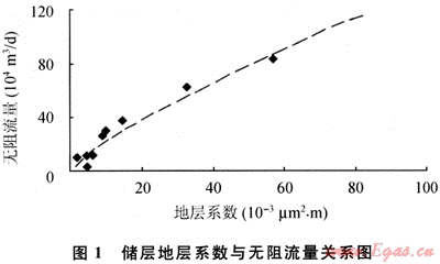 試采表明,氣井產(chǎn)能與可流動區(qū)域的地層系數(shù)具有一定的相關(guān)性,氣井的無阻流量隨著地層系數(shù)的增加而增大(圖1)。同樣儲層有效流動區(qū)域的過膜也影響到氣井的產(chǎn)能,規(guī)模越大,單位壓降下的采氣量也就越高。
