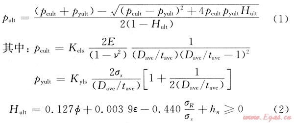 現(xiàn)場(chǎng)實(shí)測(cè)表明,套管磨損一般為非均勻磨損,其形式主要為月牙形磨損,月牙形磨損部位套管壁厚最薄,且存在較大不圓度和壁厚不均度等幾何缺陷,當(dāng)均勻外擠壓力作用于套管時(shí),將產(chǎn)生附加彎矩,形成應(yīng)力集中區(qū),進(jìn)而出現(xiàn)屈服,導(dǎo)致套管損壞。套管受到磨損,會(huì)產(chǎn)生各種形狀的幾何缺陷,磨損套管的抗擠強(qiáng)度可看作是由幾何缺陷所產(chǎn)生的。根據(jù)ISO 10400標(biāo)準(zhǔn)的抗擠強(qiáng)度最終極限狀態(tài)的公式為: