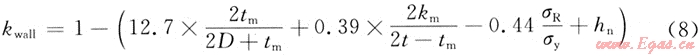 套管的抗內(nèi)壓強(qiáng)度與壁厚的允許誤差因子(kwall)有關(guān)。套管的磨損大多為月牙形磨損,與磨損對(duì)套管抗擠強(qiáng)度的影響分析相同,考慮套管的內(nèi)壁不圓度、壁厚不均度和殘余應(yīng)力的影響,則可將允許誤差因子與包含套管內(nèi)壁不圓度、壁厚不均度和殘余應(yīng)力的綜合影響系數(shù)(Hult)等效。允許誤差因子為: