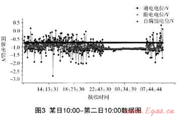 該測試樁位于公路旁邊,距電氣化鐵路200m,距高壓電塔50m,距地鐵2500m,是一處受雜散電流干擾較為典型的測試樁。測試數(shù)據(jù)圖形如圖3: