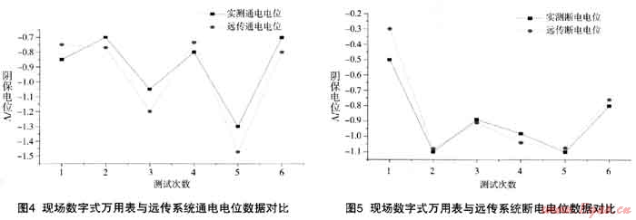 南圖4和圖5所示,南無線采集系統(tǒng)和數(shù)字萬用表測得的通/斷電電位數(shù)據(jù)是很接近的,通電電位數(shù)據(jù)誤差在15%之內(nèi),這可能是由于此處管道受干擾較大,電位變動很快,人工記錄的時間無法完全精確同步,所以,存在一定的人為引入誤差,不完全是儀器的誤差。而斷電電位誤差基本在5%之內(nèi)。這說明所采用的無線遠傳系統(tǒng)測量結(jié)果是準確的,相對于數(shù)字式萬用表測量,采用無線采集傳輸系統(tǒng)在測量通/斷電電位時可避免人為讀數(shù)造成的誤差,在長時間連續(xù)監(jiān)測數(shù)據(jù)時能夠大大減少工作人員的勞動強度,提高效率,因此,對于雜散電流干擾區(qū)的測量,無線采集傳輸系統(tǒng)具有明顯優(yōu)勢。