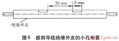 感測(cè)導(dǎo)線(xiàn)的絕緣外皮有規(guī)則的孔(見(jiàn)圖6),小孔可以感知保溫層濕度的變化??椎拈g隔為20mm,每個(gè)小孔的寬度為1.5mm。漏點(diǎn)檢測(cè)系統(tǒng)要求感測(cè)導(dǎo)線(xiàn)、反饋導(dǎo)線(xiàn)與管道之間的阻抗以及兩導(dǎo)線(xiàn)之間的絕緣電阻必須大于等于50MΩ。