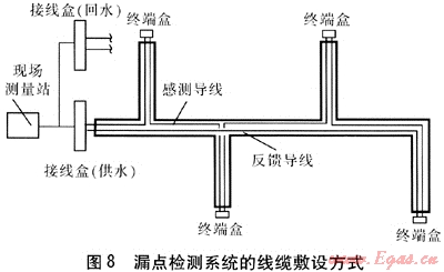 漏點(diǎn)檢測(cè)系統(tǒng)線(xiàn)纜敷設(shè)必須遵循以下原則:只有感測(cè)導(dǎo)線(xiàn)敷設(shè)至分支管,反饋導(dǎo)線(xiàn)不敷設(shè)到分支管。漏點(diǎn)檢測(cè)系統(tǒng)的線(xiàn)纜敷設(shè)方式見(jiàn)圖8,圖8僅為供水管道的線(xiàn)纜敷設(shè)方式,回水管道需另外敷設(shè)線(xiàn)纜。