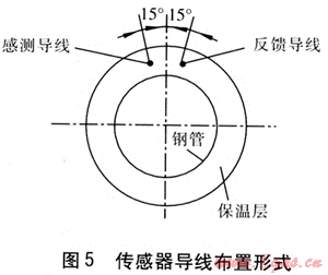 使用鎳鉻合金線(xiàn)作為傳感器導(dǎo)線(xiàn),分為感測(cè)導(dǎo)線(xiàn)、反饋導(dǎo)線(xiàn),兩根導(dǎo)線(xiàn)總稱(chēng)為傳感器導(dǎo)線(xiàn)。供熱管道制造過(guò)程中,在每段管道中安裝兩根導(dǎo)線(xiàn),傳感器導(dǎo)線(xiàn)布置形式見(jiàn)圖5。