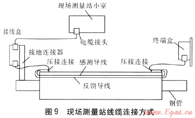 現(xiàn)場(chǎng)測(cè)量站線(xiàn)纜連接方式見(jiàn)圖9。主要連接裝置有:現(xiàn)場(chǎng)測(cè)量站小室內(nèi)安裝漏點(diǎn)檢測(cè)模塊、通信模塊等;現(xiàn)場(chǎng)測(cè)量站小室與接線(xiàn)盒之間的連接電纜;帶有接地連接器的接線(xiàn)盒;用于連接感測(cè)導(dǎo)線(xiàn)與反饋導(dǎo)線(xiàn)的終端盒等?,F(xiàn)場(chǎng)測(cè)量小室、接線(xiàn)盒、終端盒、連接電纜的防護(hù)等級(jí)均為IP65。