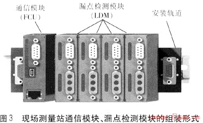 現(xiàn)場(chǎng)測(cè)量站通信模塊、漏點(diǎn)檢測(cè)模塊的組裝形式見(jiàn)圖3,所有模塊均安裝在軌道底板上,結(jié)構(gòu)簡(jiǎn)單,安裝方便。漏點(diǎn)檢測(cè)模塊的作用是:測(cè)量管道與傳感器導(dǎo)線(xiàn)之間的阻抗;通過(guò)傳感器導(dǎo)線(xiàn)與其他漏點(diǎn)檢測(cè)模塊通信(采用管段兩端測(cè)量時(shí));支持不同管段通信模塊間的數(shù)據(jù)傳輸;當(dāng)有泄漏發(fā)生時(shí),發(fā)出報(bào)警信號(hào)。