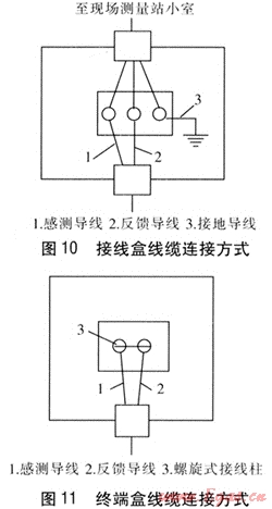每一段檢測(cè)管段安裝一個(gè)接線(xiàn)盒,接線(xiàn)盒安裝在接地連接器上,接地導(dǎo)線(xiàn)與接地連接器連接,接地連接器焊接在管道上做到接地良好。接線(xiàn)盒經(jīng)連接電纜與現(xiàn)場(chǎng)測(cè)量站小室相連,接線(xiàn)盒線(xiàn)纜連接方式見(jiàn)圖10。在管段的末端安裝終端盒,將感測(cè)導(dǎo)線(xiàn)與反饋導(dǎo)線(xiàn)相連,終端盒線(xiàn)纜連接方式見(jiàn)圖11。