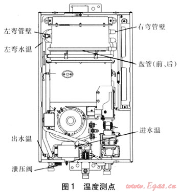 圖1為溫度測(cè)點(diǎn),此外,還有室外溫度和熱水器周圍溫度(廚房、冷陽(yáng)臺(tái)),其中左彎水溫、進(jìn)水溫、出水溫采用在水管上鉆孔將溫度探頭伸進(jìn)管中測(cè)水溫形式,其余各點(diǎn)則測(cè)水管外壁。