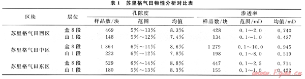 蘇里格氣田主力層二疊系盒8段、山1段儲層形成于沖積背景下的河流沉積體系,河道內(nèi)部結(jié)構(gòu)復(fù)雜,隔夾層發(fā)育,非均質(zhì)很強。對氣田范圍內(nèi)93口取心井氣層段巖心分析進(jìn)行統(tǒng)計,結(jié)果表明:孔隙度主要范圍在5%~12%之間,平均值為8.69%;滲透率主要范同為0.1~2mD,平均為0.733mD。各區(qū)塊之間存在一定差異,中區(qū)總體上好于西區(qū)和東區(qū)(表1)。