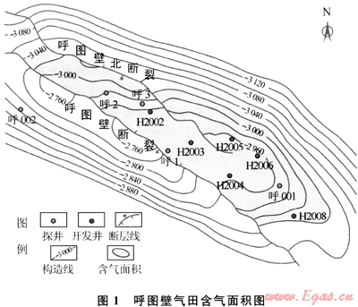 1996年,呼2井射開(kāi)紫泥泉子組獲日產(chǎn)天然氣78.3×104m3、凝析油18.82m3的高產(chǎn)油氣流,從而發(fā)現(xiàn)了呼圖壁氣田。于1998年10月投入試采,2000年全面投入開(kāi)發(fā),共有氣井7口,動(dòng)用含氣面積15.2km2,動(dòng)用天然氣地質(zhì)儲(chǔ)量126.12×108m3。