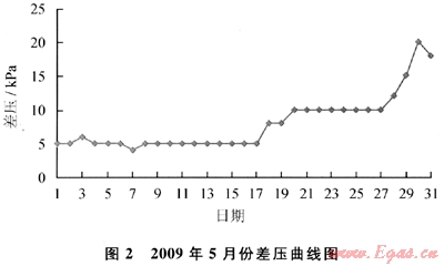 試驗(yàn)裝置連續(xù)平穩(wěn)運(yùn)行前4個(gè)月,進(jìn)出口差壓變化很小,一直在5kPa以內(nèi),每天平均排放液體約80kg。2009年5月19日起試驗(yàn)裝置進(jìn)出口差壓開始增高,5月30日達(dá)到20kPa,差壓曲線圖如圖2所示,已超出15kPa的設(shè)計(jì)監(jiān)控值,但還沒影響到壓縮機(jī)的正常運(yùn)行。2009年6月5日更換了試驗(yàn)裝置中的4#凈化器的濾料,經(jīng)分析,試驗(yàn)裝置進(jìn)出口壓差突然增高的原因是高效氣體(深層)過濾器內(nèi)的中空纖維濾料吸收液態(tài)雜質(zhì)達(dá)到飽和所致。