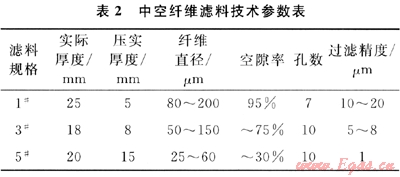 上?;ぱ芯吭貉兄频腟RI系列特制中空纖維濾料是一種具有一定過濾層數(shù)且選擇不同纖維直徑、不同空隙率及不同厚度的多種纖維組成的過濾濾料[8],濾料使用的特制纖維為中空多孔結(jié)構(gòu),纖維直徑的范圍為1~40μm,因此纖維還特別具備“吸附”作用(毛細(xì)管效應(yīng)),非常適合于過濾含有一定水分、油分及細(xì)微雜質(zhì)的氣體。目前上海化工研究院已經(jīng)研究開發(fā)出40余種不同空隙率、不同過濾精度及不同材質(zhì)的SRI系列纖維濾料,可以根據(jù)工藝要求相應(yīng)調(diào)整過濾精度。