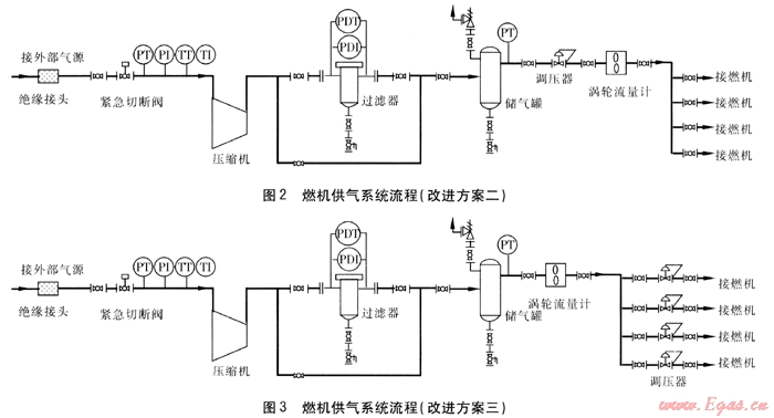 方案三:改進(jìn)思路與方案二相同,即在原系統(tǒng)中增加燃?xì)庹{(diào)壓器。本方案中調(diào)壓器不是設(shè)在儲(chǔ)氣罐之后,而是設(shè)在每臺(tái)燃機(jī)的燃料進(jìn)口處,壓縮機(jī)的設(shè)定壓力與方案二相同。本方案的工藝流程見圖3。