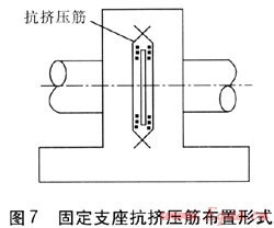 ③ 為了避免靠近環(huán)形鋼擋板兩邊的混凝土局部受壓,在環(huán)形鋼擋板兩側(cè)布置24根直徑不小于18mm的抗擠壓筋。固定支座抗擠壓筋布置形式見圖7。
