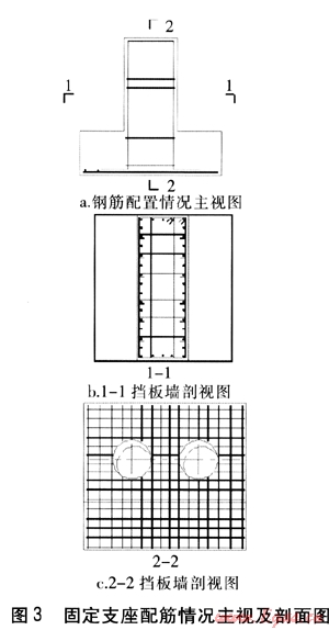 為了保證固定支座有能夠承受管道推力的足夠強(qiáng)度,需要在固定支座的擋板墻及底板內(nèi)配置一定數(shù)量的鋼筋,見圖3。