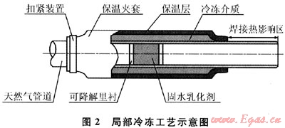 試驗(yàn)研究表明局部冷凍封堵技術(shù)可成功應(yīng)用于小管徑天然氣管道的局部冷凍封堵,對(duì)隔離管內(nèi)油氣是行之有效的。局部冷凍封堵技術(shù)的作業(yè)管道承壓能力可超過(guò)2.5MPa,明顯優(yōu)于現(xiàn)有管道局部化學(xué)封堵技術(shù),承壓時(shí)間完全滿足管道焊接的要求,施工方便快捷,安全可靠,可實(shí)現(xiàn)不置換動(dòng)火的技術(shù)需求。焊接施工完成后,當(dāng)固水乳化劑的溫度高于0℃,固水乳化劑即恢復(fù)原來(lái)狀態(tài),待天然氣管道恢復(fù)輸氣時(shí)隨天然氣一起排出。