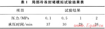管道局部封堵的原理是通過(guò)向管道中放入具有一定強(qiáng)度的封堵物,利用其與管道壁面之間的摩擦力或結(jié)合力來(lái)實(shí)現(xiàn)局部封堵,皮囊封堵與機(jī)械封堵均屬于這一范疇。局部冷凍封堵通常是將管道中可凍結(jié)的流體冷凍,通過(guò)冷凍段來(lái)承受壓力,起到隔離的作用。小管徑天然氣管道要采用冷凍封堵,必須先注入可凍結(jié)流體(常用的可凍結(jié)流體是水),再進(jìn)行冷凍。為了驗(yàn)證水變成冰后自身的承壓能力以及與管壁的結(jié)合力能否承受較高的氣壓,筆者在Φ60mm×8mm的試驗(yàn)管道內(nèi)密封一段長(zhǎng)100mm水柱,將試驗(yàn)管道放于冰柜中進(jìn)行冷凍,使水凍成冰,再在室溫(15℃)下加氣壓,進(jìn)行局部冷凍封堵模擬試驗(yàn),試驗(yàn)結(jié)果見表1。