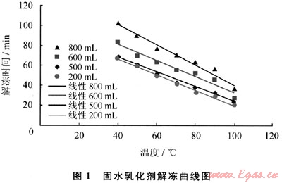 分別取固水乳化劑800mL、500mL、300mL、200mL,將它們冷凍固化后,看其是否產(chǎn)生裂紋;在不同的溫度下解凍,獲取解凍時(shí)間。試驗(yàn)結(jié)果見表2和圖1。試驗(yàn)結(jié)果表明固水乳化劑解凍后恢復(fù)成原來(lái)的膏狀,且具有良好的質(zhì)密性。