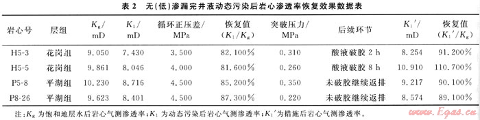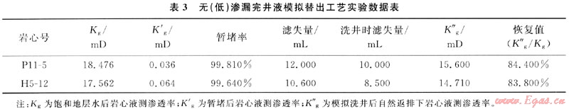 滲透率恢復(fù)值為120~130,但有沉淀、分層和絮凝,說(shuō)明與地層水的配伍性良好。但是為考察無(wú)(低)滲漏完井液體系在高溫作用下的保護(hù)儲(chǔ)層效果即巖心滲透率恢復(fù)值情況,選取目標(biāo)層4塊巖心進(jìn)行完井液動(dòng)態(tài)污染實(shí)驗(yàn),實(shí)驗(yàn)溫度為120~130℃,動(dòng)態(tài)循環(huán)正壓差為3.5~4.5MPa,實(shí)驗(yàn)數(shù)據(jù)見(jiàn)表2。