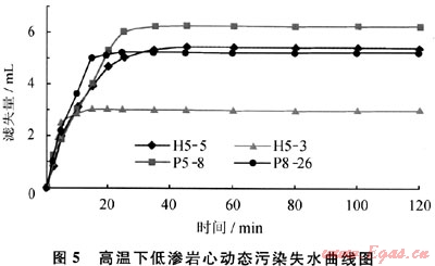 濾失性無(wú)(低)滲漏完井液體系在動(dòng)態(tài)污染試驗(yàn)的前20min,5塊巖心動(dòng)態(tài)失水速率普遍較大,這可能是因?yàn)檐涱w粒狀完井液受擠壓時(shí)發(fā)生的物理脫水現(xiàn)象,但總量均沒(méi)有超過(guò)7mL。20min左右,致密的碳化膠質(zhì)暫堵層逐漸形成,加上軟顆粒本身的物理暫堵功能,雙重暫堵下巖心基本不再發(fā)生濾失(圖5),說(shuō)明無(wú)(低)滲漏完井液高溫下與巖心接觸時(shí)發(fā)生的化學(xué)質(zhì)變有利于控制完井液的失水滲漏。從濾失量減少為0的時(shí)間可看出,膠質(zhì)暫堵層在120~130℃下形成的時(shí)間在20min左右,最低的約6min,如H5-3號(hào)巖心,6min左右濾失量就降至為0,這可能與巖心中的黏土礦物類(lèi)型和總含量有關(guān)。