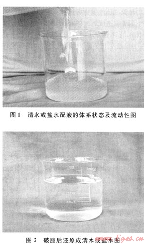 無(wú)(低)滲漏完井液主要由有機(jī)高分子吸水材料膠凝劑、絡(luò)合淡水中二價(jià)陽(yáng)離子的螯合劑、調(diào)節(jié)流變性的穩(wěn)定劑組成?;九浞綖椋旱?0.5%螯合劑YF-1+1%~2%膠凝劑SW-1+0.5%穩(wěn)定劑WDJ-1。完井液由毫米級(jí)的軟顆粒組成,顆粒尺寸分布在0.5~3mm,軟顆粒易變形,有一定強(qiáng)度,該完井液體系用酸液能完全破膠,并能還原成清水(圖1、2)。