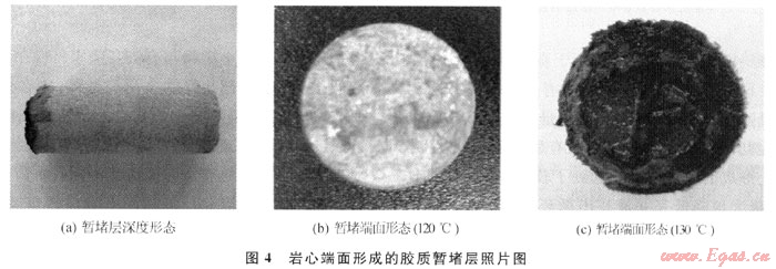 從表2中實(shí)驗(yàn)數(shù)據(jù)可知:低滲巖心自然反排的突破壓力較低,均小于0.4MPa,滲透率恢復(fù)值均超過(guò)80%,如果反排時(shí)間繼續(xù)延長(zhǎng),巖心滲透率恢復(fù)值還可繼續(xù)得以恢復(fù),無(wú)(低)滲漏完井液所形成的暫堵層完全可以自然解堵,在完井和修井結(jié)束后,無(wú)論采用連續(xù)油管或氣舉都很容易誘噴解堵。用酸液破膠后,巖心的滲透率恢復(fù)值會(huì)繼續(xù)增加,甚至可超過(guò)100%,但對(duì)于低滲透氣藏,為減少液相部分滯留而造成水相圈閉損害,不推薦采用酸液破膠。另外,實(shí)驗(yàn)中有了新發(fā)現(xiàn):巖心端面在高溫下形成了一種黃至黑色膠質(zhì)致密暫堵層,有一定強(qiáng)度,不能用手輕易刮開(kāi),深度約3mm(圖4-a),且隨著實(shí)驗(yàn)溫度增加暫堵層顏色加深(圖4-b、c),認(rèn)為是有機(jī)高分子完井液在接觸巖心時(shí)發(fā)生碳化(熱催化)反應(yīng)所得,這與新型完井液體系的構(gòu)建思路基本一致。