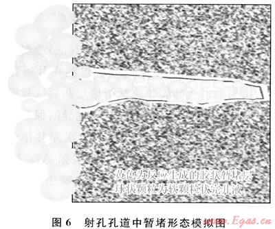 根據(jù)化學(xué)反應(yīng)定律中溫度時(shí)間互為補(bǔ)償理論[11],在射孔期間巖石瞬間的高溫便可加速擠入炮眼中的有機(jī)高吸水材料的碳化(熱催化)反應(yīng),碳化暫堵層的形成時(shí)間將大為縮短,可有效降低完井液的漏失。雙重暫堵模型見(jiàn)圖6。