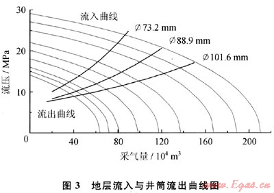 單井采注氣能力的大小,受地層滲流能力和井筒流動能力兩方面因素影響,只有當(dāng)?shù)貙恿魅肽芰εc井筒流出能力協(xié)調(diào)一致時,也即在流入流出曲線圖(圖3)中曲線交匯處氣井的生產(chǎn)能力才是最高的。