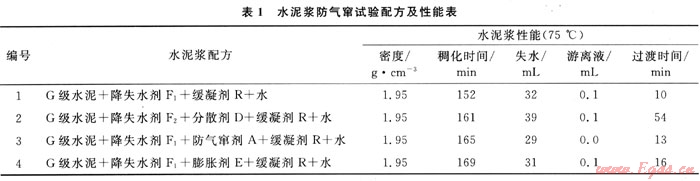 使用作者所述的水泥漿防氣竄性能評(píng)價(jià)方法,對(duì)國內(nèi)一些氣田的尾管固井水泥漿配方進(jìn)行了研究。研究表明,現(xiàn)場固井效果和室內(nèi)結(jié)果有很好的一致性。下面給出一些代表性的實(shí)例: