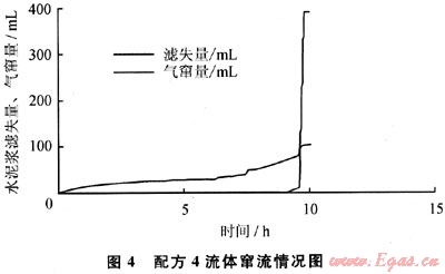 圖3所示為配方3水泥漿氣竄試驗(yàn)的流體竄流情況。從圖3中可知,向含有降失水劑F1的水泥漿中摻入一定量的膠乳類防氣竄劑A后,由于該類防氣竄劑可以通過在水泥漿內(nèi)部擠壓成膜等作用來限制氣體在水泥漿中的運(yùn)移,提高了該水泥漿在候凝期間的內(nèi)部結(jié)構(gòu)阻力,因而極大地提高了該水泥漿的防氣竄能力。