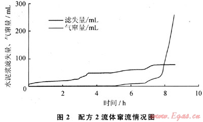 圖1所示為配方1水泥漿氣竄試驗(yàn)的流體竄流情況。從圖1可知,單純降失水劑F1雖然能有效控制水泥漿的失水,但是由于該配方在候凝期間不能有效限制水泥漿內(nèi)流體的運(yùn)移,在水泥漿面臨氣層流體威脅時(shí)不能有效增加水泥漿的抗氣體入侵阻力。因此,該類水泥漿體系的防氣竄效果不是很理想。
