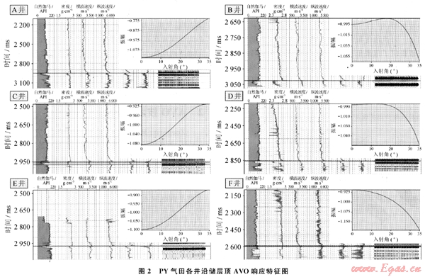 從圖2中可見:PY地區(qū)構造圈閉內的井(A井、C井、E井)氣層頂表現為振幅隨偏移距增大而減小的趨勢;復合圈閉內的含氣砂巖(D井、F井)則表現為振幅隨偏移距增加而增大的特征,不同圈閉類型的儲層AV0響應特征不同的根本原因在于坡折帶上沉積環(huán)境不同,導致泊松比關系不同,從而影響到AV0響應特征;含水砂巖(B井)則表現為振幅隨偏移距增加而增大的含氣的特征。因此,在研究區(qū)用AV0技術預測儲層的含油氣性具有很大的不確定性。