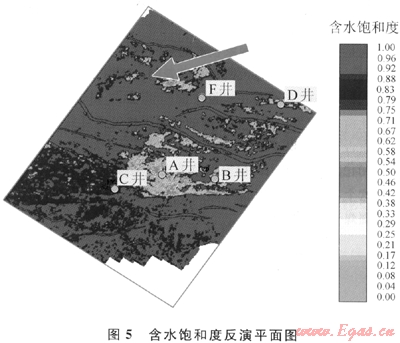 多屬性反演技術即是利用測井曲線和地震數據的關系“預測”或估測地震體上所有點的測井曲線特征體。利用基于神經網絡的多屬性反演技術得到了研究區(qū)的含水飽和度圖5。綜合分析圖4、5,認為圖4所示的F井北部應是一個相對高含水的區(qū)域,其余各井儲層含油氣性的預測結果與實鉆結果較符合(圖5)。