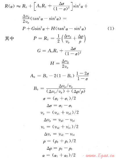Zoeppritz理論是AV0技術的核心,完整的Zoeppritz方程[2]全面考慮了平面縱波和橫波入射在平界面兩側產生的縱橫波反射和透射能量之間的關系。當反射波地震勘探使用主要產生縱波的震源、接收的是反射縱波時,Zoeppritz公式可以被大大簡化,即只考慮平面縱波入射產生的反射振幅隨入射角的變化情況。一方面可以節(jié)省計算工作量,另一方面更有利于AV0技術的研究和應用。R.T.Shuey給出的簡化公式是目前人們使用最多的Zoeppritz近似方程[3]: