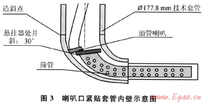 3) 目前尾管懸掛器座掛位置一般位于井斜30°左右處。因此,油管喇叭口在經(jīng)過該井段時(shí)其端面勢(shì)必緊貼套管內(nèi)壁,致使無法順利進(jìn)入懸掛器回接筒內(nèi)(圖3)。