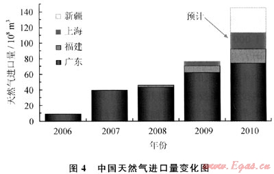 進(jìn)口液化天然氣(LNG)正在幫助緩解因需求迅速上升給國內(nèi)市場供應(yīng)帶來的壓力。自2006年5月26日國內(nèi)第一船進(jìn)口6×104t澳大利亞液化天然氣運(yùn)抵深圳大鵬灣以來,國內(nèi)進(jìn)口液化天然氣設(shè)施已發(fā)展到3座,分布在廣東深圳、福建莆田和上海洋山,規(guī)模分別為370×104t/a、260×104t/a和300×104t/a。2009年液化天然氣進(jìn)口量已由2006年的69×104t猛增到553×104t(76×108m3)(圖4)。進(jìn)口液化天然氣以用作發(fā)電和工業(yè)燃料為主,也有一部分進(jìn)入城市天然氣管道,滿足民用燃?xì)庑枨蟆kS著上海洋山進(jìn)口設(shè)施轉(zhuǎn)入正常運(yùn)轉(zhuǎn),并保障上海世博會(huì)期間的燃?xì)夤?yīng),中海油3座進(jìn)口設(shè)施2010年的進(jìn)口量可能會(huì)輕易超過800×104t。今后兩三年內(nèi),當(dāng)中石油江蘇如東和遼寧大連以及中海油浙江寧波共3座在建進(jìn)口設(shè)施建成投產(chǎn)時(shí),液化天然氣年進(jìn)口規(guī)模將由現(xiàn)在的930×104t擴(kuò)大到1880×104t。中海油預(yù)計(jì)到2020年僅該公司就將擁有5000×104t/a進(jìn)口液化天然氣接收能力。