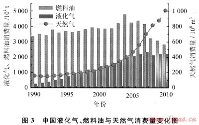 天然氣市場現(xiàn)正處于高速增長的時(shí)期。在西氣東輸項(xiàng)目完工并于2004年10月開始向華東地區(qū)供氣后的5年里,國內(nèi)天然氣消費(fèi)量年均增幅達(dá)17%,2009年消費(fèi)量已增加到874×108m3[6]。而在這之前,20世紀(jì)90年代10年里的年均增幅只有4.5%。2010年,國內(nèi)天然氣消費(fèi)量估計(jì)將達(dá)到1050×108m3,到2020年預(yù)計(jì)將增長兩倍達(dá)到3000×108m3,受沖擊最大的是燃料油和液化氣,液化氣需求增長將受到嚴(yán)重阻礙(圖3)。