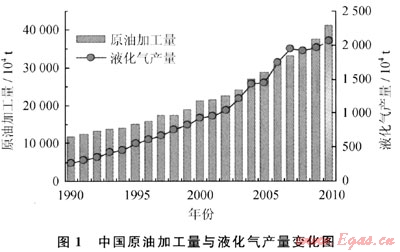 2009年先后有中海油廣東惠州1200×104t/a新煉廠、中石化福建800×104t/a和中石油新疆獨(dú)山子1000×104t/a擴(kuò)建蒸餾裝置等多座新增和擴(kuò)建原油一次加工裝置建成投產(chǎn),合計(jì)能力超過4000×104t/a。新增煉油能力集中投產(chǎn)使得包括液化氣在內(nèi)的油品供應(yīng)能力增長超過需求。