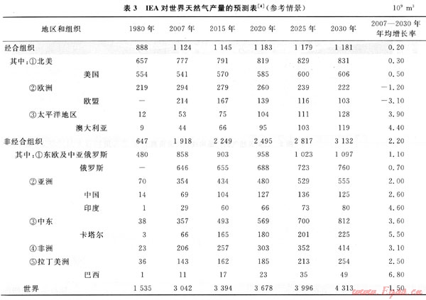 對(duì)天然氣已探明儲(chǔ)量的認(rèn)識(shí)大家比較一致,對(duì)于已知?dú)馓锏膬?chǔ)量增長(zhǎng)量、待發(fā)現(xiàn)天然氣的常規(guī)資源量和非常規(guī)資源量有許多機(jī)構(gòu)和學(xué)者做過預(yù)測(cè)。在此基礎(chǔ)上國(guó)際能源署(IEA)在2008年對(duì)世界天然氣產(chǎn)量進(jìn)行了預(yù)測(cè)(表3)。