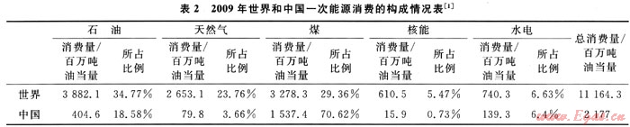 與世界相比,中國(guó)一次能源消費(fèi)結(jié)構(gòu)更不合理(表2),單位能耗的C02排放量較大。中國(guó)化石能源占總量的92.8%,而世界為87.89%;中國(guó)化石能源的主體是煤炭,占70.62%,而世界為29.36%?;茉粗蠧02排放量相對(duì)較低的天然氣,在中國(guó)能源構(gòu)成中僅占3.66%,而世界為23.6%;非化石能源中水電的比例中國(guó)與世界相近,但核能僅為0.73%,而世界為5.47%(表2)。由此可見,中國(guó)降低C02排放、改善能源結(jié)構(gòu)的任務(wù)更加艱巨。