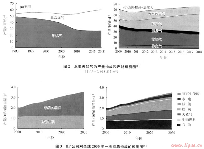 表4表明,2009年美國(guó)的天然氣儲(chǔ)量為6.93×1012m3,而俄羅斯為44.38×1012m3,美國(guó)的儲(chǔ)量?jī)H為俄羅斯的15.6%。如果從儲(chǔ)量和產(chǎn)量的相關(guān)性而言,很難理解美國(guó)的產(chǎn)量超過俄羅斯這個(gè)事實(shí)。其根本原因是,由于非常規(guī)天然氣的特殊性,雖已有很高產(chǎn)量,但仍未計(jì)入儲(chǔ)量數(shù)據(jù)統(tǒng)計(jì)。2009年美國(guó)的非常規(guī)天然氣的產(chǎn)量幾乎與常規(guī)氣相當(dāng)。根據(jù)劍橋能源的預(yù)測(cè)[5],未來的美國(guó)和整個(gè)北美(包括加拿大)的非常規(guī)天然氣產(chǎn)量將超過常規(guī)氣,其中頁(yè)巖氣將起到重要作用(圖2)。