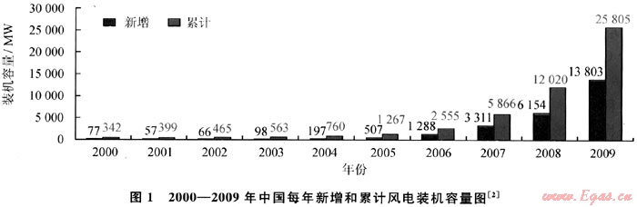 要完成上述指標(biāo)的任務(wù)十分艱巨。一次能源總需求量仍在高速增長(zhǎng),預(yù)計(jì)完成工業(yè)化在2030年左右,這段時(shí)間內(nèi)化石能源總產(chǎn)量不僅不可能下降,反而仍將繼續(xù)上升。可再生能源和核能在2009年占總能源消費(fèi)的7.13%,要達(dá)到2020年的目標(biāo),需要提高7.87%。目前來看核電最為現(xiàn)實(shí),而太陽(yáng)能和風(fēng)能的間歇性、不容易控制和難以儲(chǔ)存等問題在技術(shù)上尚未得到圓滿解決,成本也較高。如風(fēng)能近幾年發(fā)展十分迅速,2009年裝機(jī)總?cè)萘恳堰_(dá)25805MW[2](圖1),但發(fā)電量卻僅為裝機(jī)容量的12%(269×108kWh)。太陽(yáng)能熱發(fā)電比燃煤發(fā)電的用水量多68%。僅僅依靠核能和可再生能源實(shí)現(xiàn)一次能源總量增長(zhǎng)和C02減排,也存在相當(dāng)大的困難。